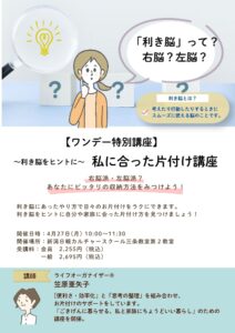 【ワンデー特別講座】 私に合った片付け講座 ~利き脳をヒントに~